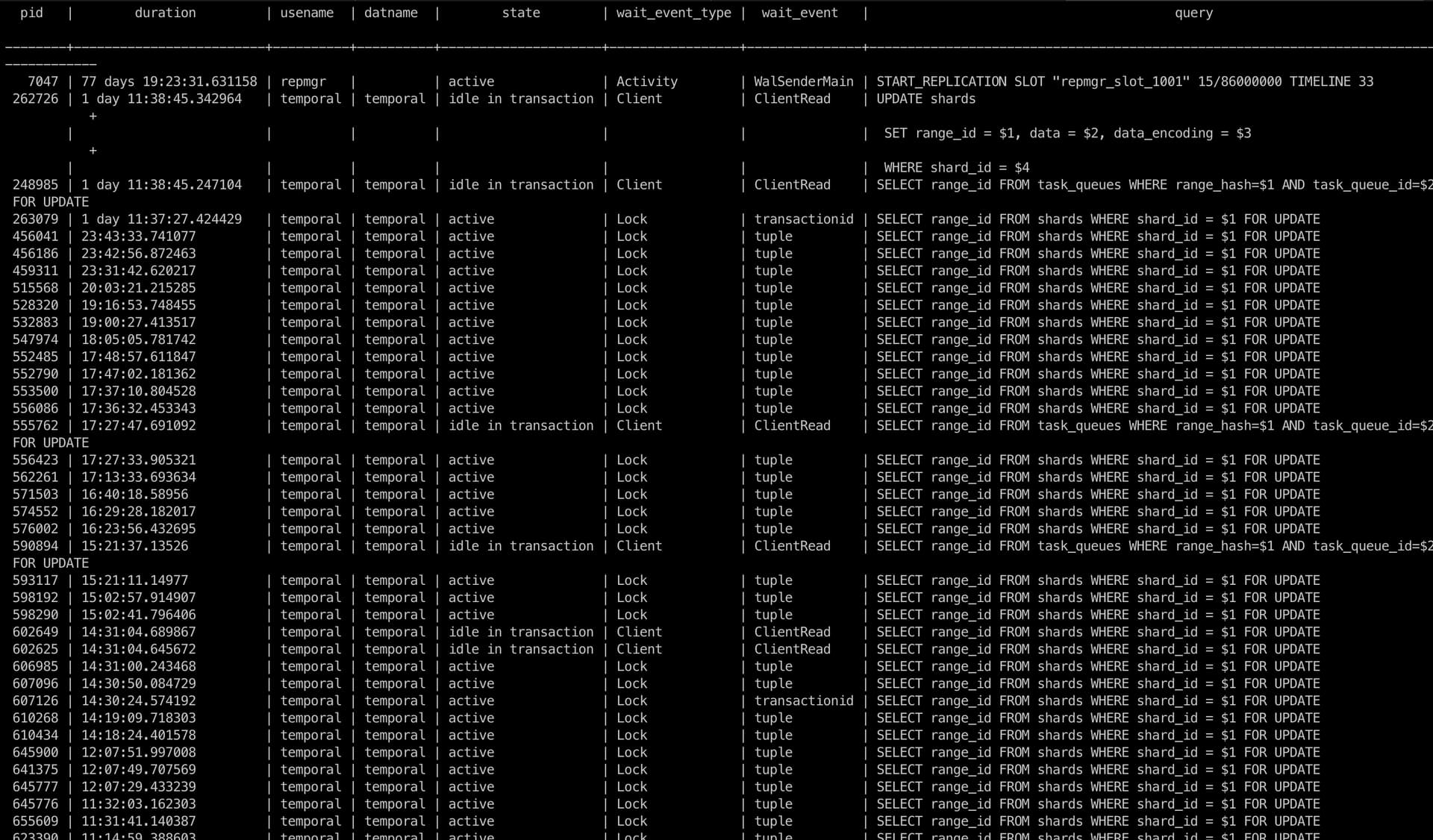 We are getting DB connections count for temporal user above 60 (Limit is 70 per user in our setup) sometimes it goes above 100 as well, and there is a pattern to it. A lot of queries are being blocked and in long running for more than an hour and whenever I flush the blocked queries connections count decreases and comes back to normal.